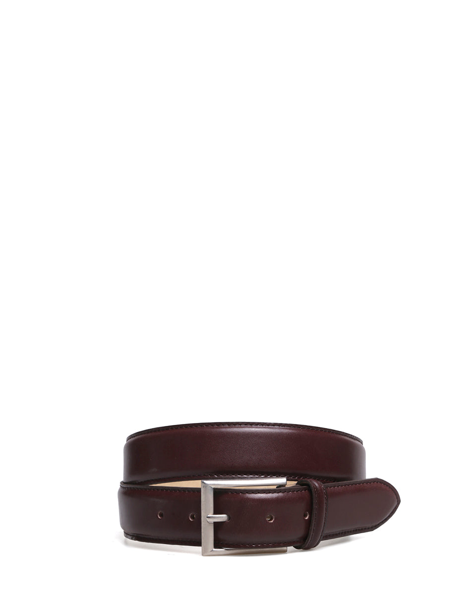 BURGOS es un cinturón de cuero marrón con pátina al tono. Está confeccionado en cuero vacuno y forrado en cuero natural. La hebilla rectangular es de níquel. Este cinto es versátil, clásico y combinable