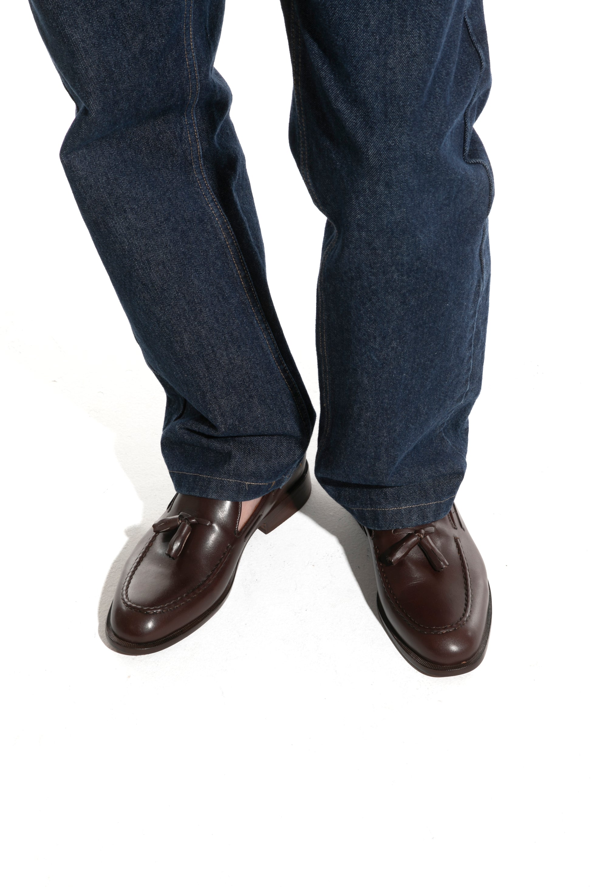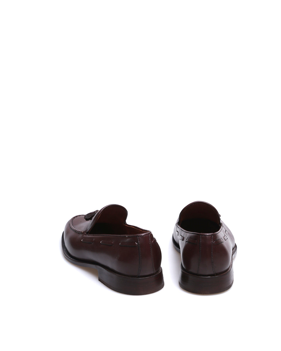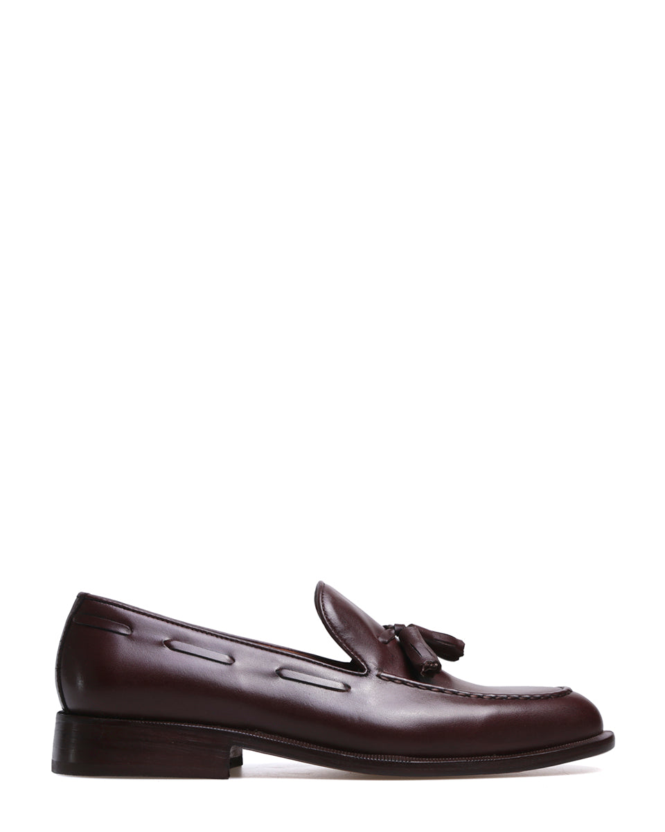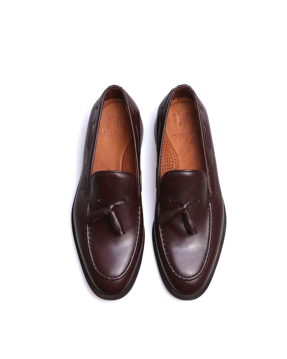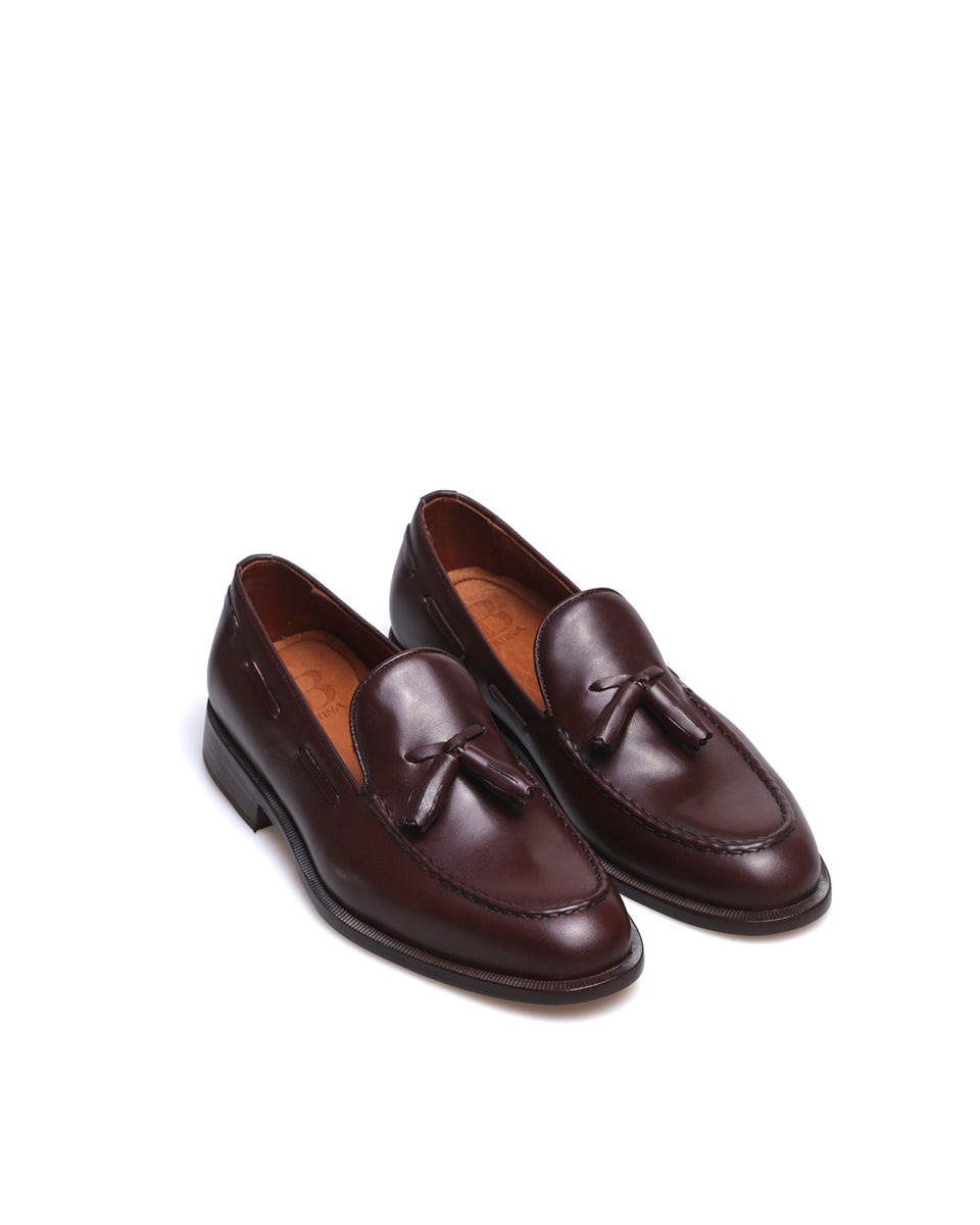 JEY es un mocasín de vestir con pompón. Está realizado en cuero vacuno liso y forrado en cuero. La capellada cuenta con un pompón y con costura talabartera. La horma es ligeramente estilizada y la suela es de cuero. JEY es un zapato elegante y atemporal ideal para vestir.