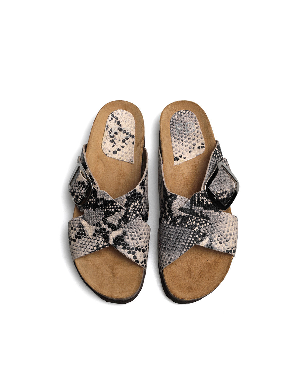 BAPE es una sandalia chata de calce directo. Está realizada en cuero vacuno graneado con terminación al corte. Sus tiras se cruzan logrando una buena ergonomía. Su hebilla de níquel realza el diseño. La base es de corcho con látex por lo cual es liviana y flexible. BAPE es un calzado práctico y canchero, ideal para los días de verano.