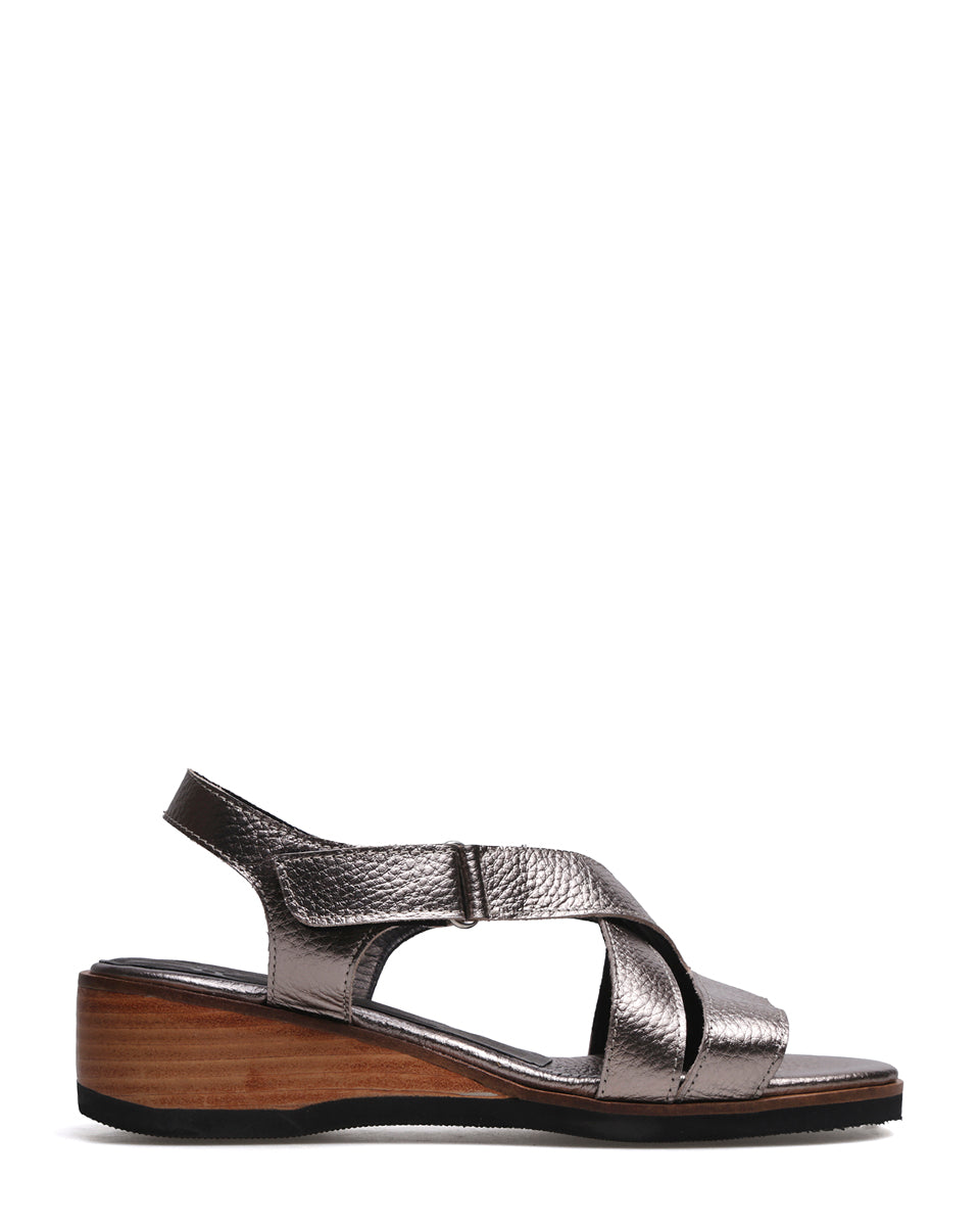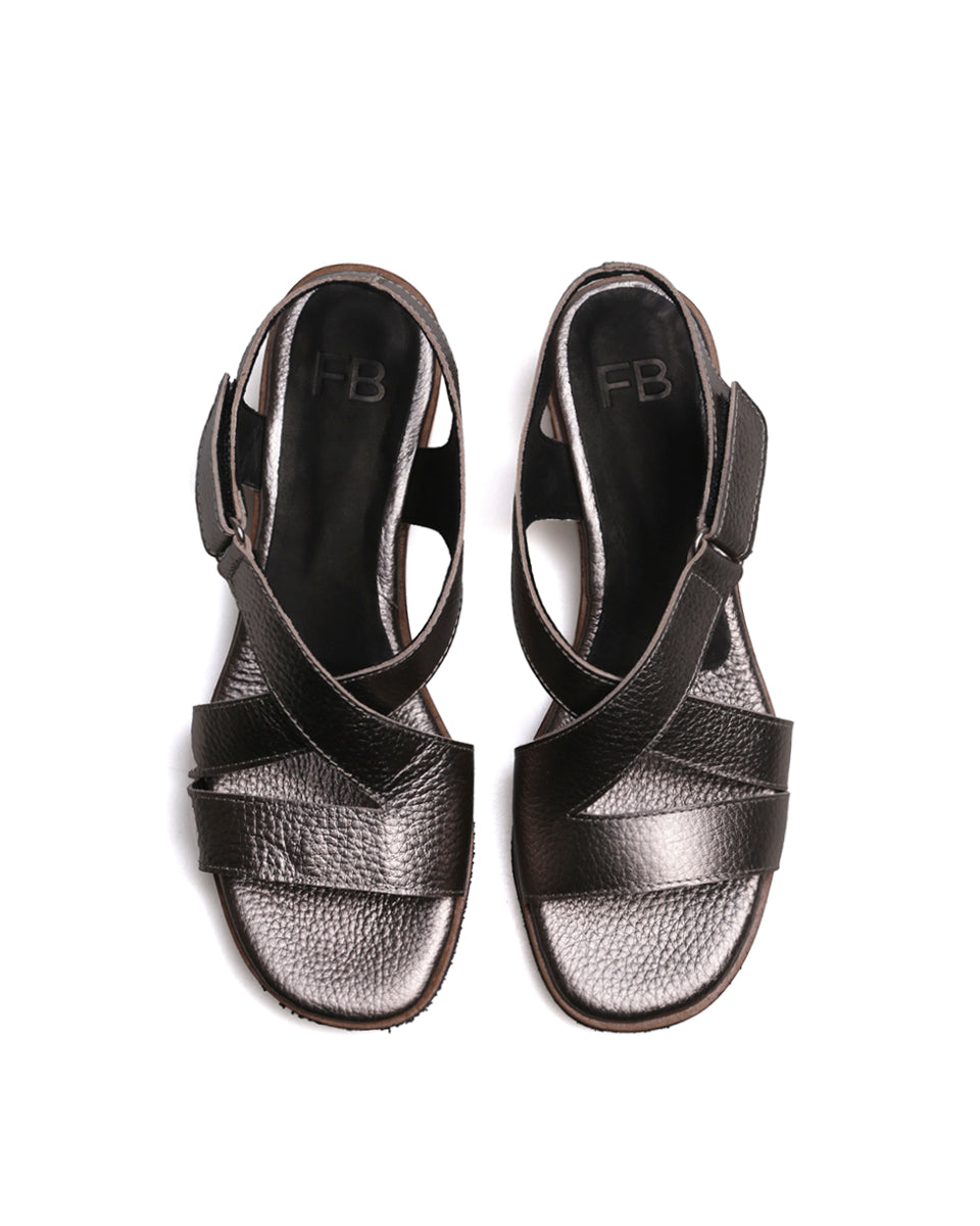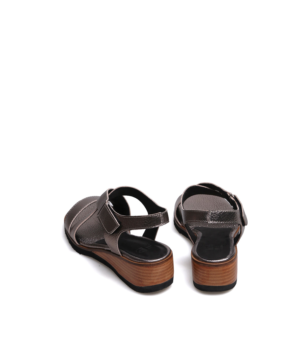 GANTE es una sandalia clásica de cuero con acabado metalizado con tiras cruzadas que estilizan el pie y una tira recta al frente para mayor sujeción. Se ajusta fácilmente con velcro y cuenta con un taco chino de altura justa y pendiente equilibrada, lo que la hace cómoda y práctica. Su terminación foliada aporta un acabado elegante, ideal para un uso cotidiano con estilo atemporal.