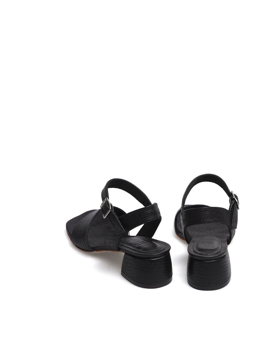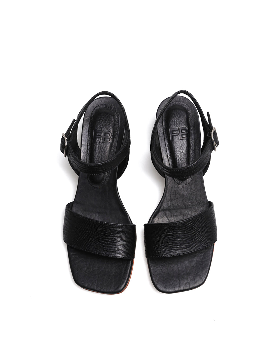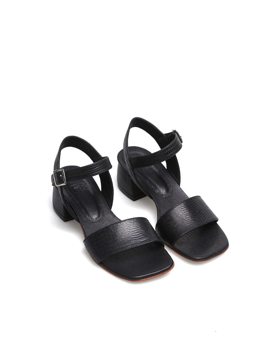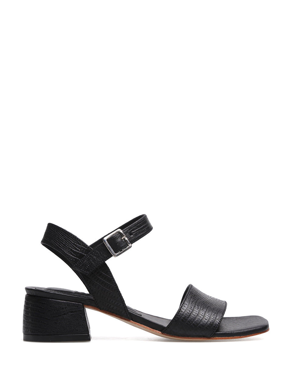 HERA es una sandalia de vestir de taco medio, realizada íntegramente en cuero. Su taco también está forrado en el mismo material, logrando un acabado uniforme y elegante. El cuero tiene una textura grabada que aporta carácter y un aire sofisticado. La puntera cuadrada la convierte en un diseño moderno y sentador.