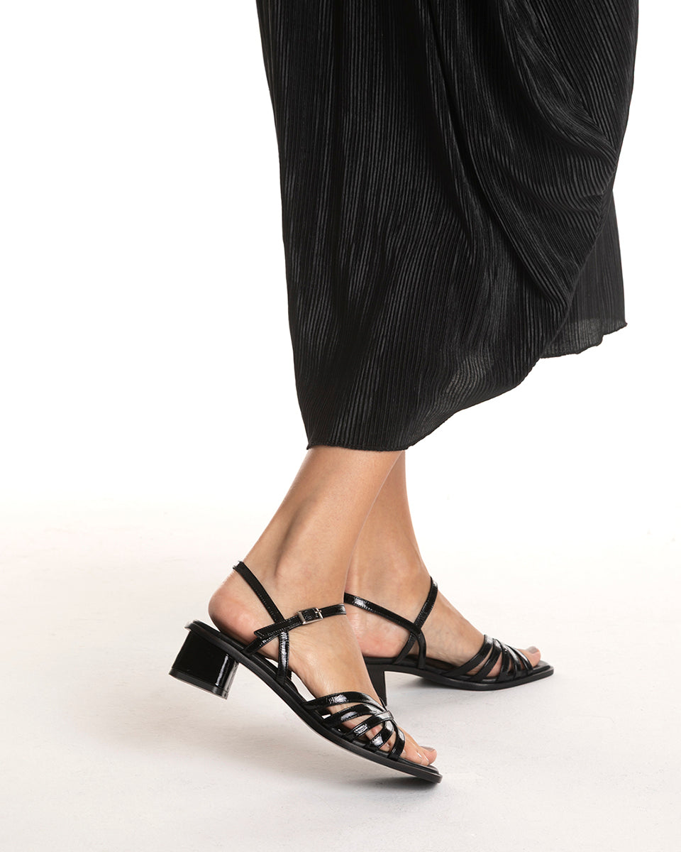 MANE es una sandalia delicada y elegante, realizada en charol de cuero con tiras finas que se entrelazan formando un diseño armónico en el empeine. Su taco medio, estable y cómodo, junto con la puntera cuadrada, la convierten en un modelo ideal para la noche o para sumar un detalle sofisticado en looks diarios.