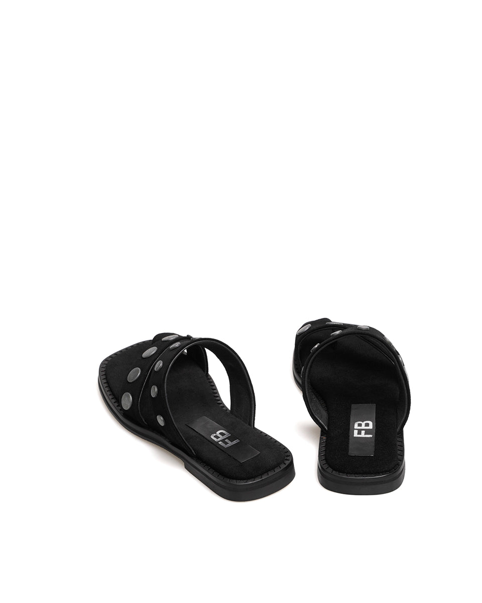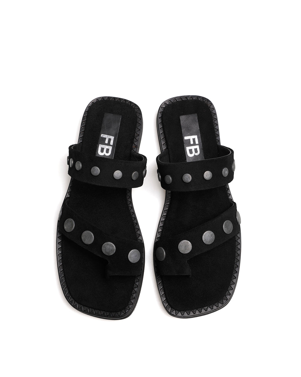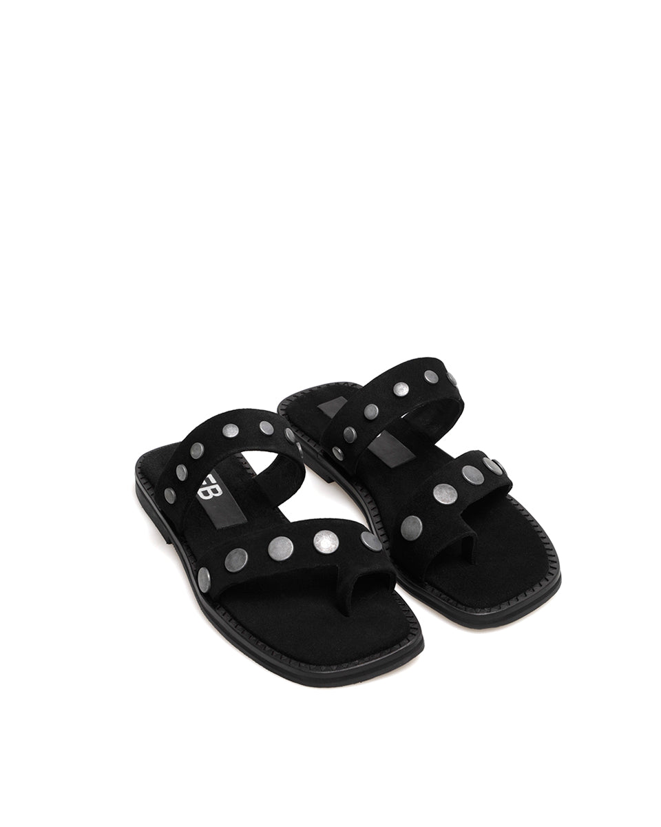MINER es una sandalia de cuero gamuzado con apliques de tachas redondas de acabado levemente desgastado. Su diseño combina dos tiras con separación para el dedo, logrando un calce cómodo y firme. La base de goma y suela flexible la hacen práctica para uso diario, con un estilo urbano y actual.