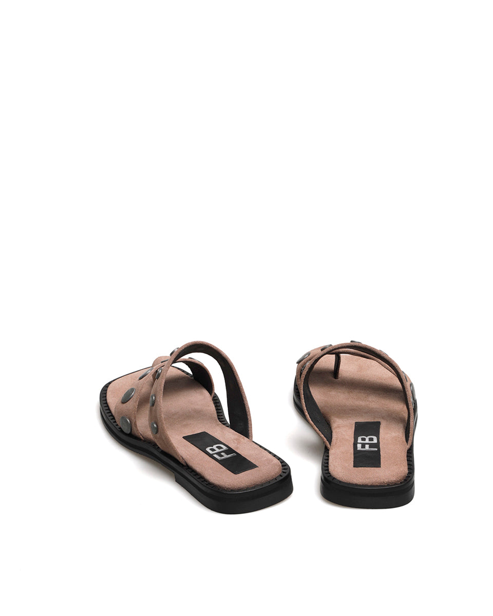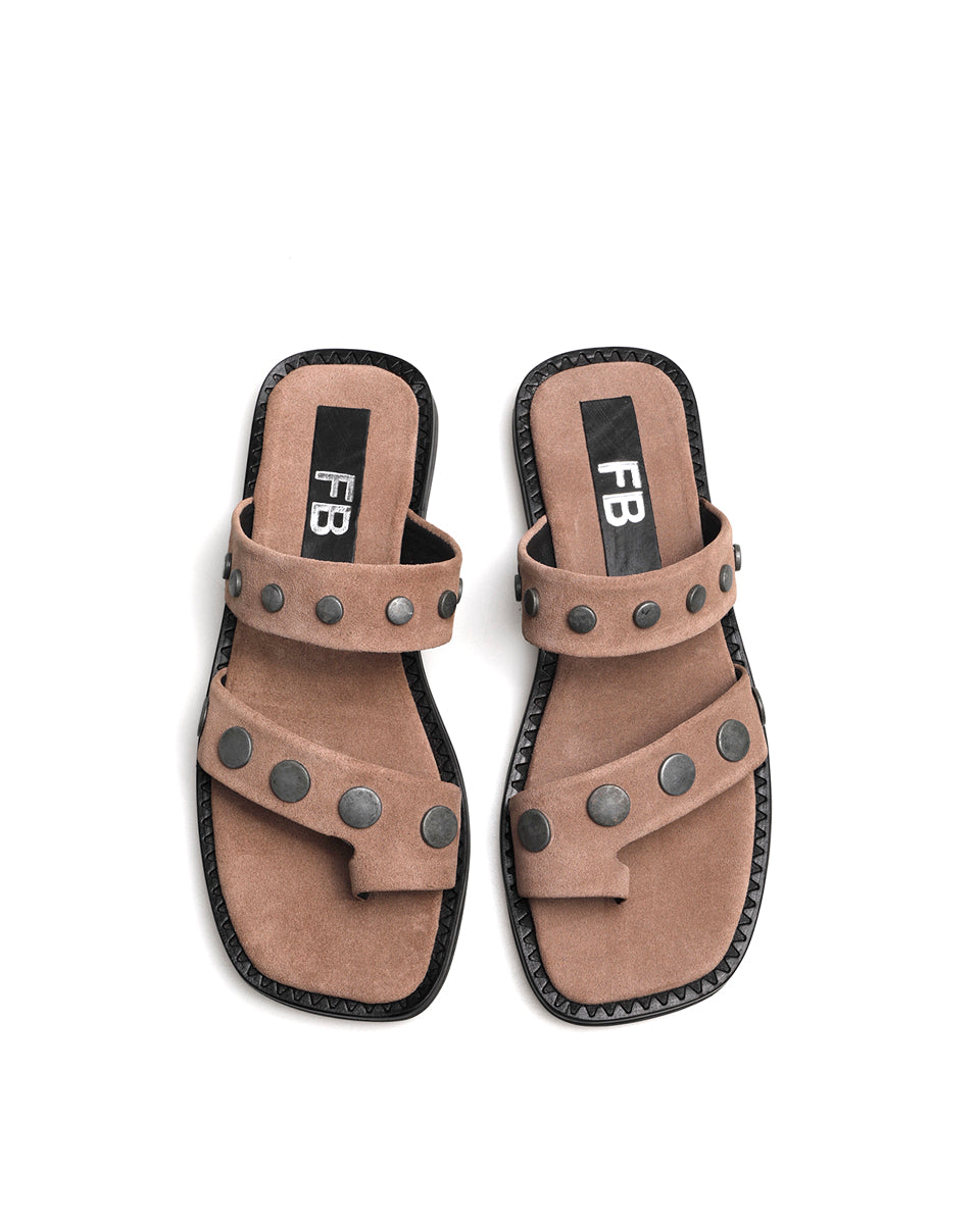 MINER es una sandalia de cuero gamuzado con apliques de tachas redondas de acabado levemente desgastado. Su diseño combina dos tiras con separación para el dedo, logrando un calce cómodo y firme. La base de goma y suela flexible la hacen práctica para uso diario, con un estilo urbano y actual.
