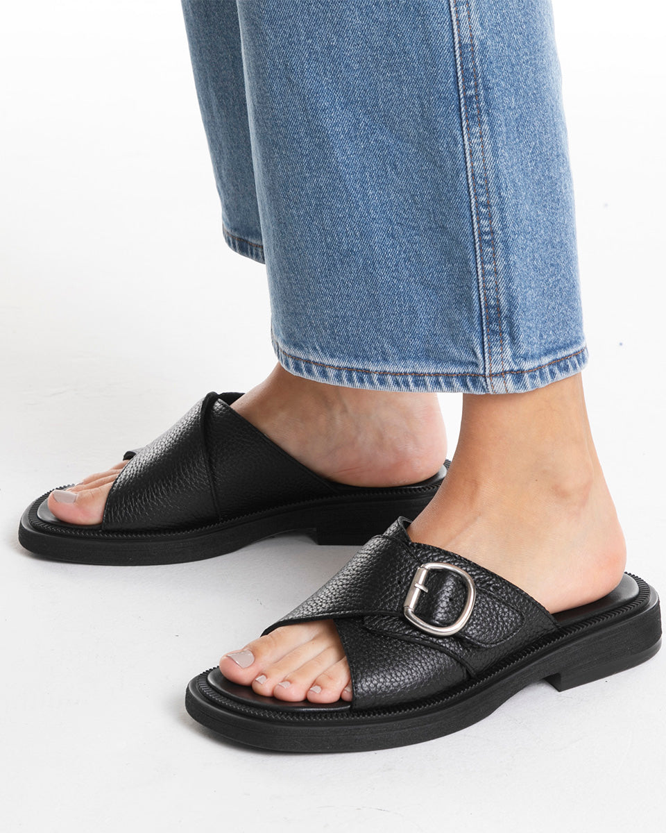 TAURO es una sandalia de calce directo con base de goma flexible y puntera suavemente cuadrada. Sus dos tiras se cruzan en el empeine formando una faja con una hebilla plateada de gran presencia. Un diseño práctico y cómodo, con un detalle distintivo que suma carácter a cualquier look.