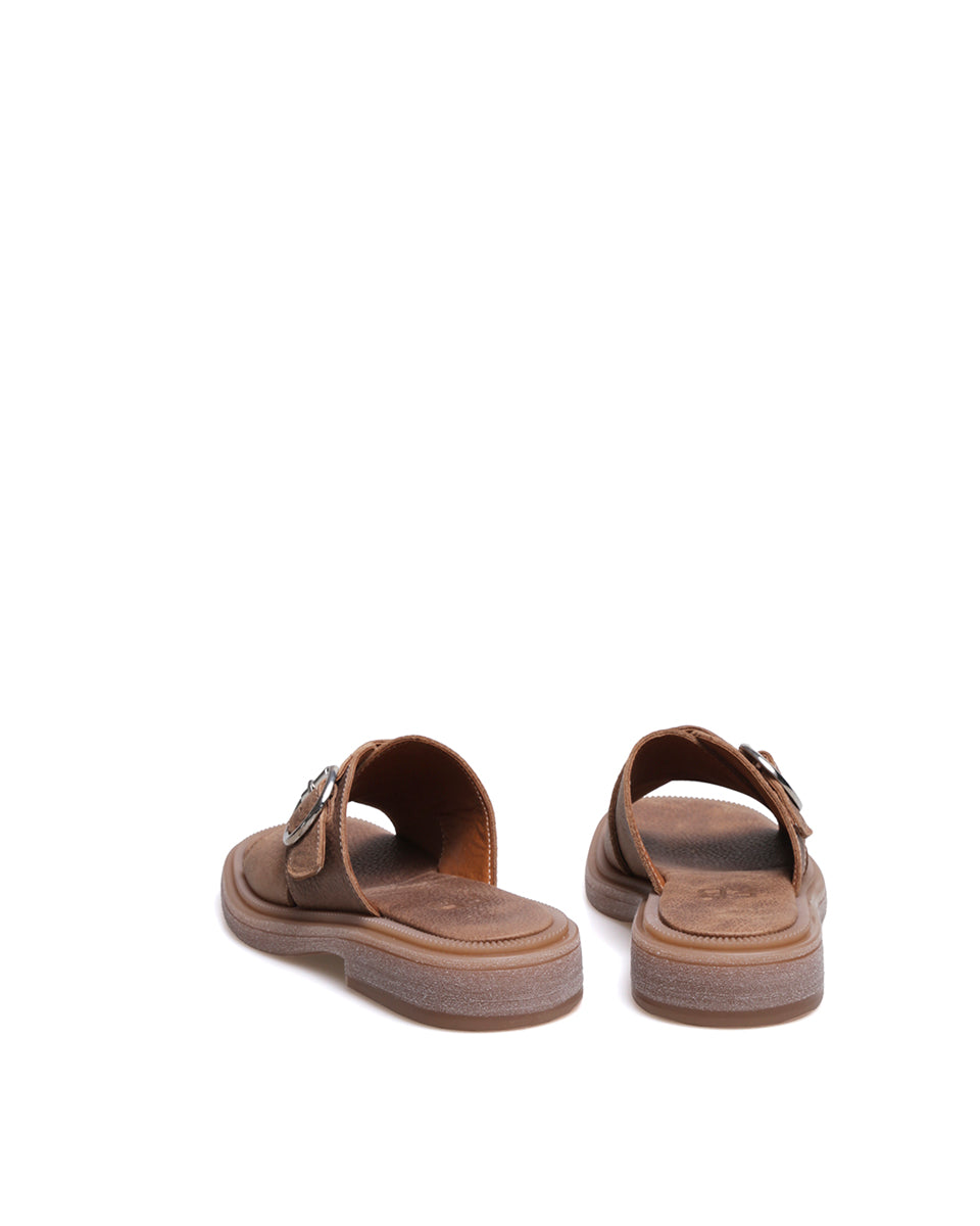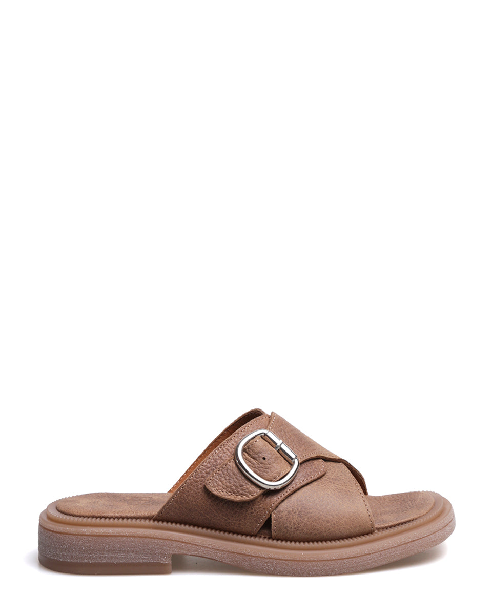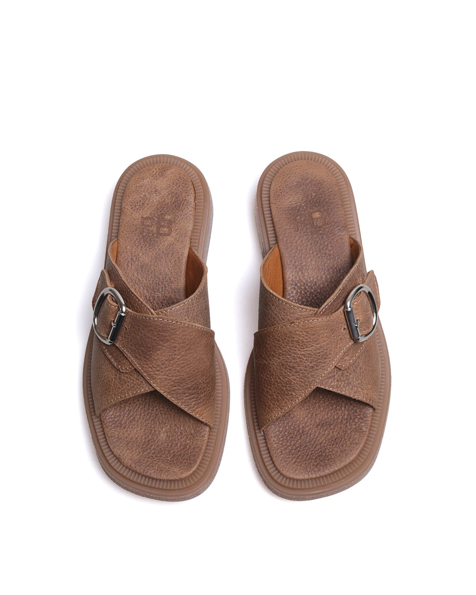TAURO es una sandalia de calce directo con base de goma flexible y puntera suavemente cuadrada. Sus dos tiras se cruzan en el empeine formando una faja con una hebilla plateada de gran presencia. Un diseño práctico y cómodo, con un detalle distintivo que suma carácter a cualquier look.