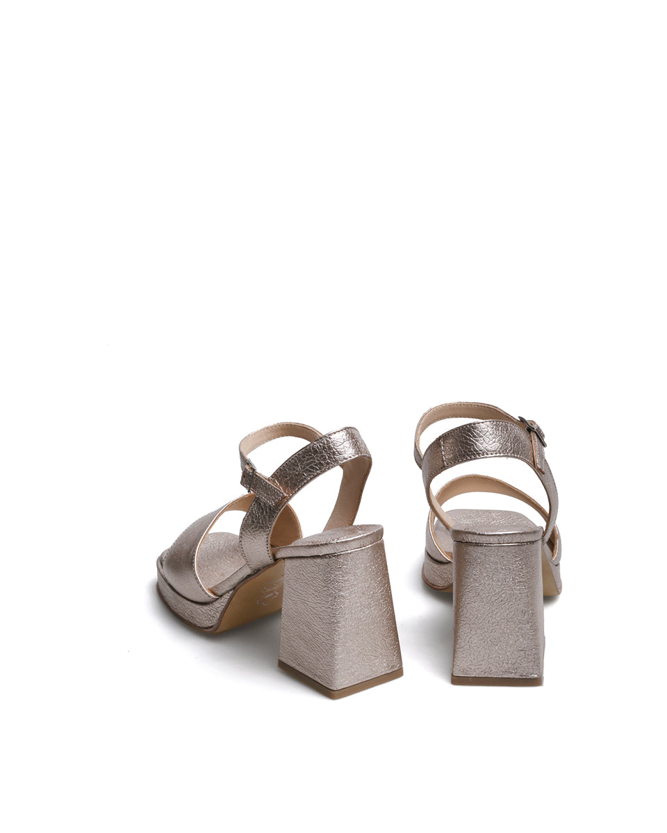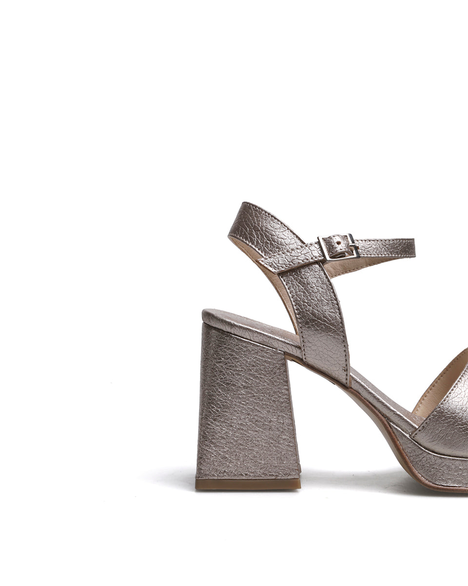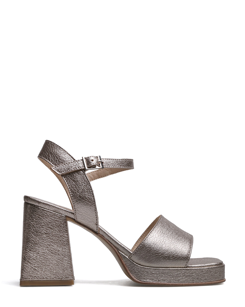 VERNET es una sandalia de cuero metalizado con taco ancho y plataforma. El diseño combina elegancia y comodidad: la plataforma suaviza la altura del taco, logrando una pisada estable y confortable. Con tiras simples y pulsera con hebilla al tobillo, es un modelo versátil que acompaña tanto looks de día como de noche.