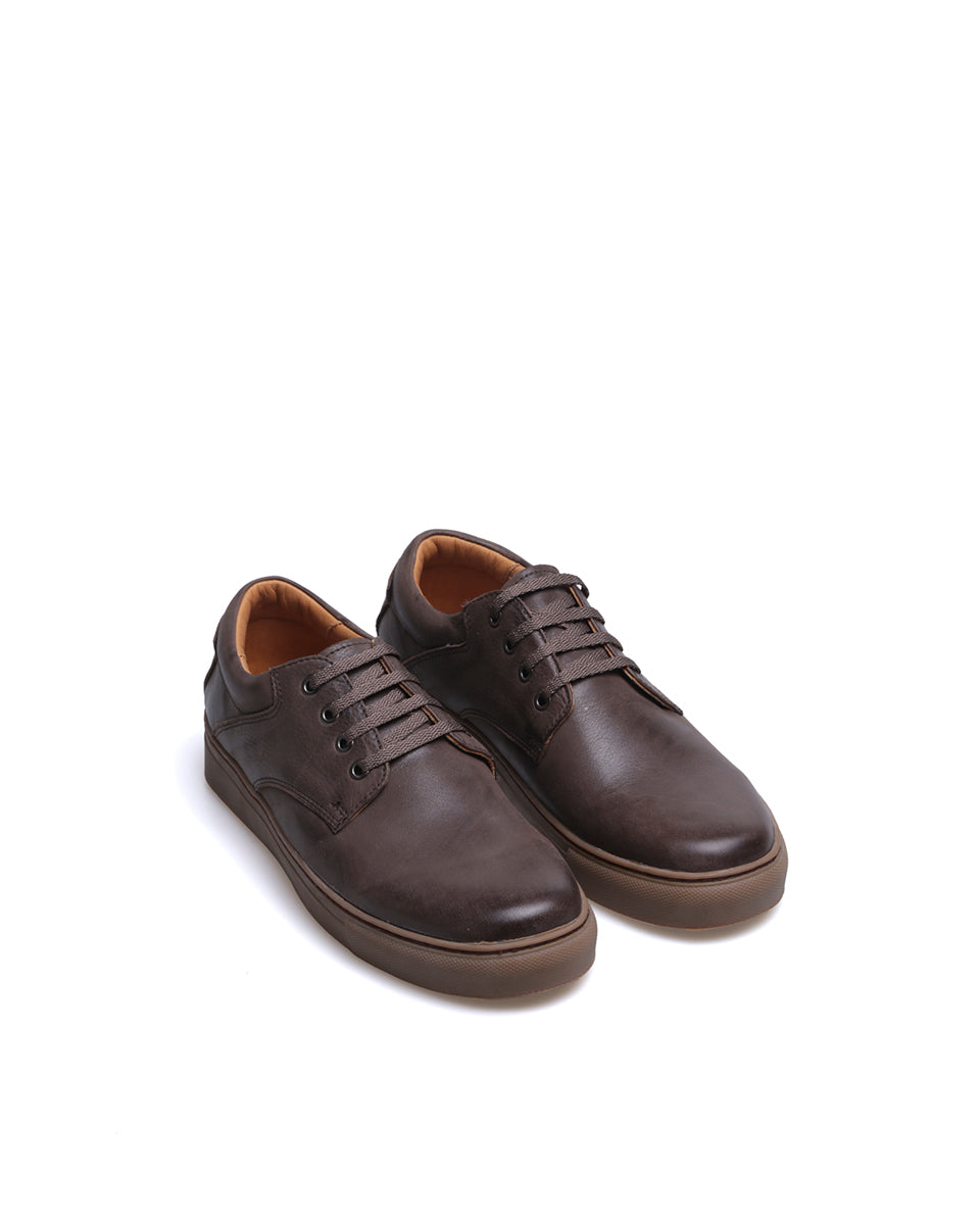 RODIO es una zapatilla urbana básica. Está realizada en cuero vacuno color marrón, forrada en cuero. La suela de goma se encuentra pegada y cosida para una mayor durabilidad. Por su diseño RODIO es un calzado que, al tener sólo cuatro ojales, da un efecto entre zapato y una zapatilla.