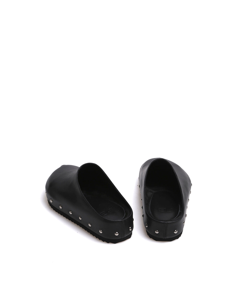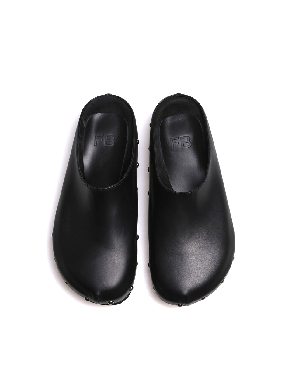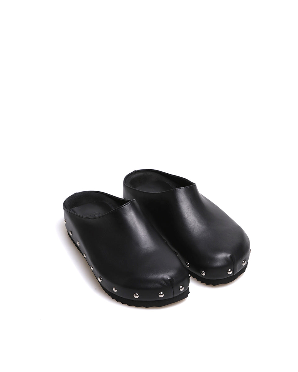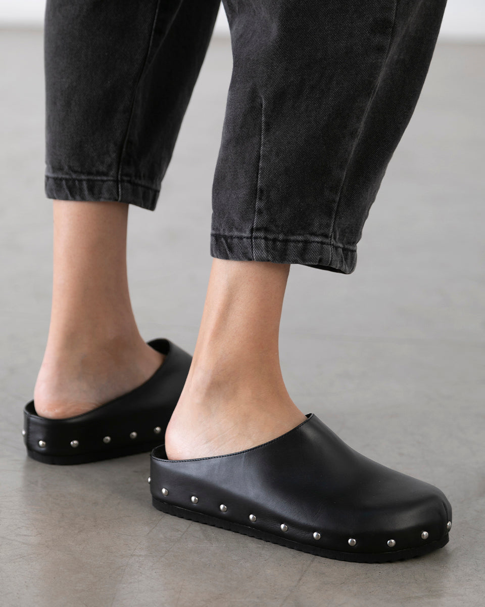 JACKIE es un zueco de cuero con tachas. Está realizado en cuero vacuno de acabado natural y forrado en cuero. La plantilla termo conformada es ideal para brindar soporte al pie. JACKIE es un calzado práctico y canchero ideal para tus outfits diarios.